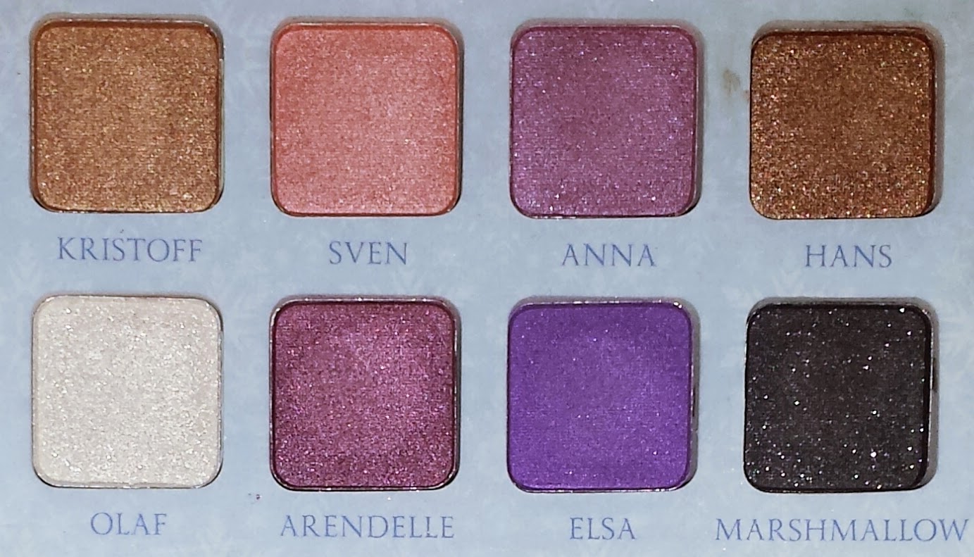 "Kristoff" is a shimmery warm bronze/gold. "Sven" looks like a warm peach in the pan but swatches more of a cool toned peach on my skin tone (I"m a little confused by why those are named as such I don't really see them in those colors at all). "Anna" is a shimmery purple with a fuchsia undertone. "Hans" is a warm shimmer bronze. "Olaf" is a shimmer white, and surprisingly not chalky like I'd expected. "Arendelle" is the prettiest of them all! a shimmer burgundy. "Elsa" is a matte purple with slight silver glitter. "Marshmellow" ?? is a matte black with slight silver glitter. The glitter shades show up pretty matte on the lid to me.